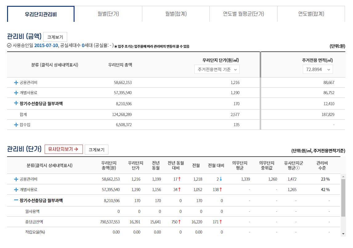 월별 관리비 : 해당 단지의 월별 관리비 내역을 상세하게 확인할 수 있습니다.